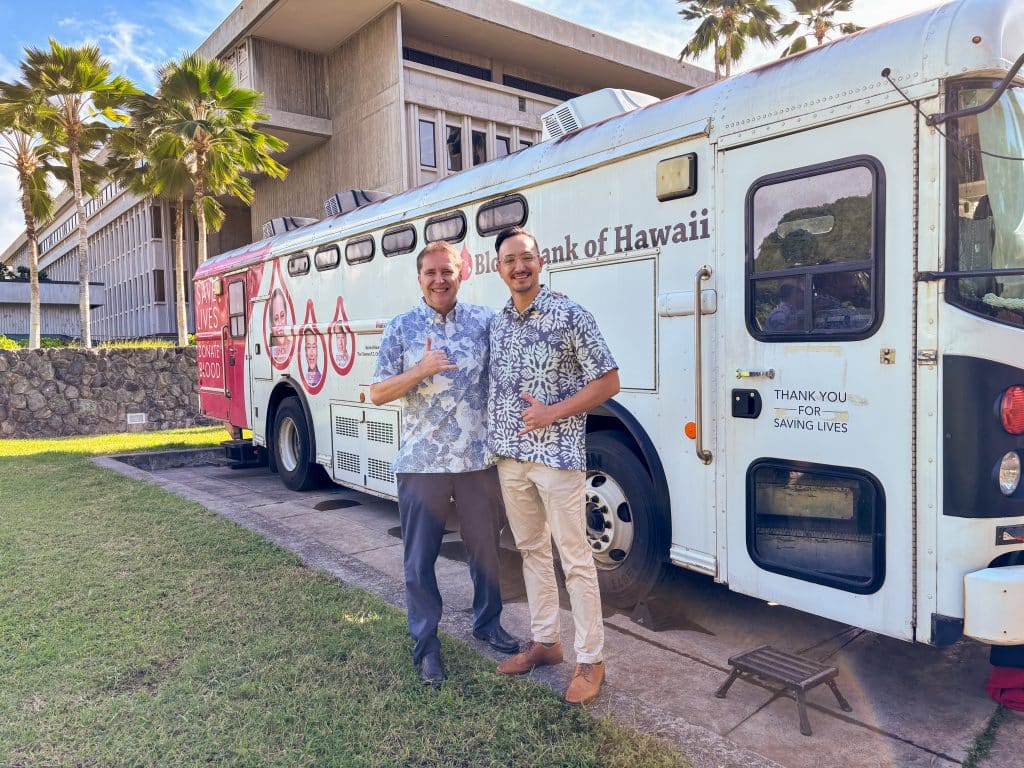 DAGS Comptroller Keith Regan and DLNR Acting Chair Ryan Kanaka‘ole smile in front of the blood mobile. Photo courtesy: DAGS.